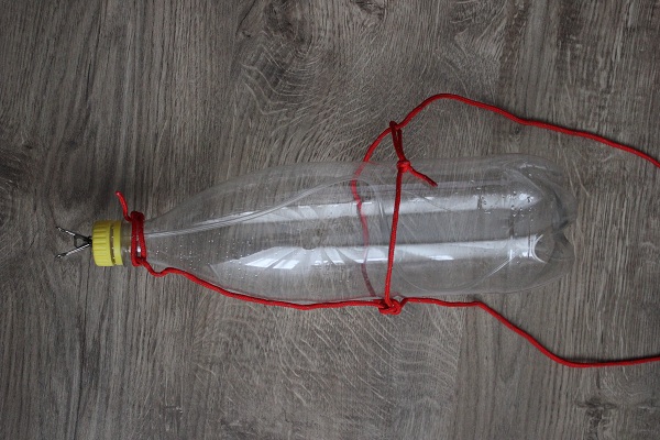 2. Возьмите прочную леску или бечевку, сложите в несколько слоев и проденьте через проделанные отверстия, дополнительно обмотайте саму бутылку для прочности. Не забудьте оставить концы, чтобы подвесить душ